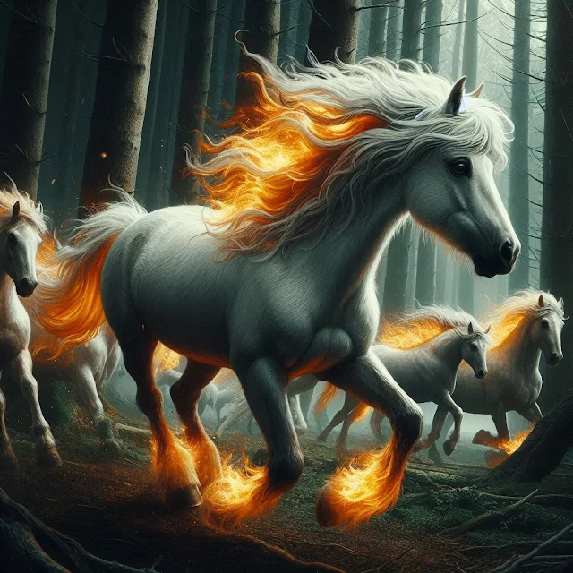 Un día, el hombre del oeste salió a cazar y vio un Rapidash en la llanura. Su exuberante melena brillaba hermosamente a la luz del sol. Cuando el hombre del oeste estaba preparando su arco, el Rapidash habló: